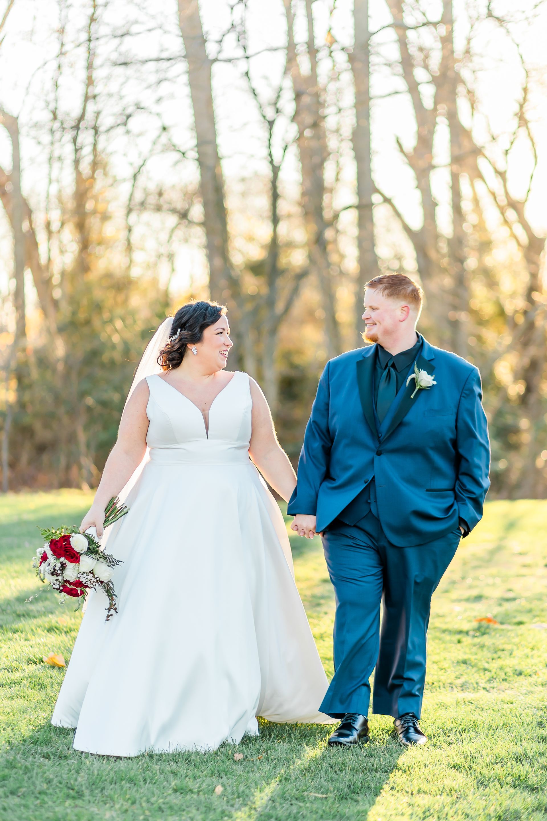 As a Monmouth County resident, Katie felt so lucky to have a plus size wedding boutique so close to home. She says, “I truly felt so beautiful trying on dresses and throughout the alteration process. Even when my dress was a little tight, there was no pressure to lose weight to fit the dress, I was assured the dress would be made perfectly to fit me no matter what. At my last appointment, when I picked up the dress, I remember feeling a little sad that it was my last visit there. The positivity and joy visiting the Curvy Bride throughout my planning process really made what could have been a stressful process, very enjoyable.” We are so thrilled to have been able to help Katie find the most perfect dress for her! “My favorite thing about my dress is its simple, classic elegance. I felt sophisticated, sexy, and sleek. The clean lines and stunning silhouette were so flattering. I also loved how the satin of my gown paired with my bridesmaids in black velvet. The Christmas and winter florals resulted in stunning photos.”