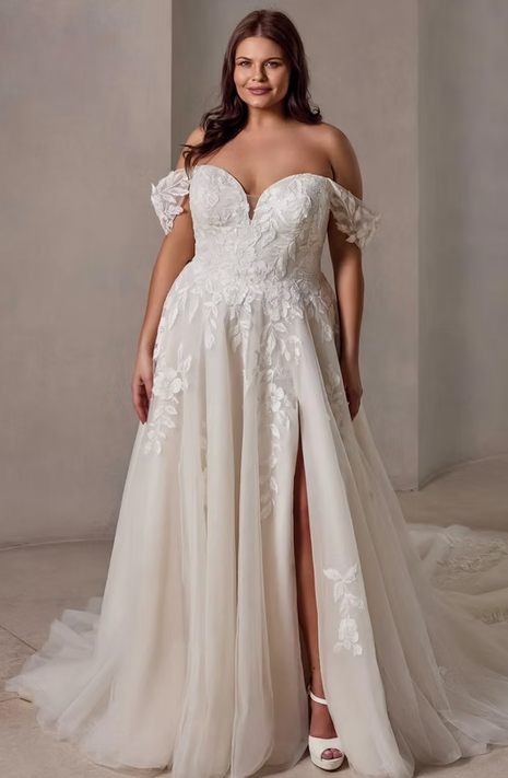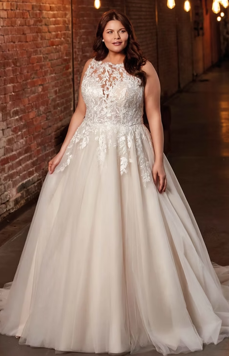 Please note that photos from our designers are not always available on plus size models, but rest assured that all of our in-store inventory ranges from sizes 14-34.